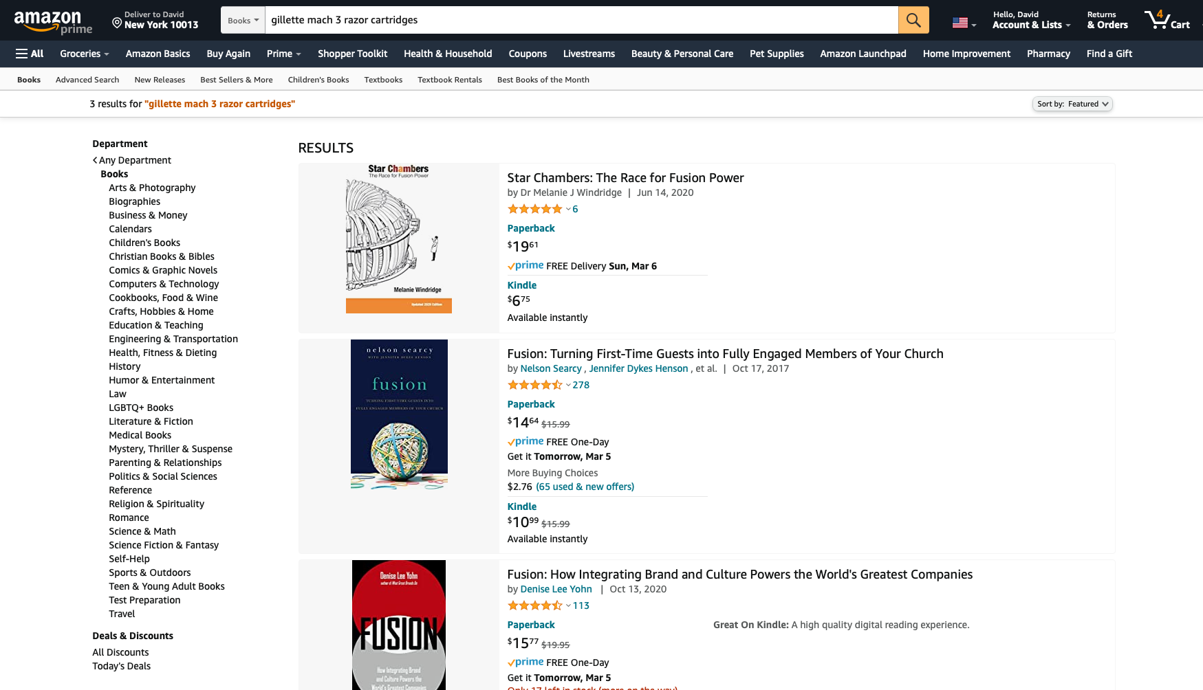 Writing this post, I wanted to be accurate. So I checked. Here are the first three results for the search "Gillette mach 3 razor cartridges"... all three are books. And, then it displays a bunch of results... but how about first "would you like to reorder the last product called this that you ordered"?