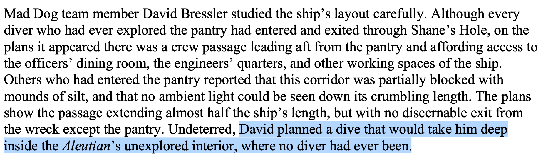- I did some wreck exploration in Uyak Bay, Alaska. It's as remote as it sounds and as cold as you'd expect. After being the diver who penetrated deepest into the shipwreck we were exploring and discovering parts of the ship no one else had, I was written up in a dive magazine.