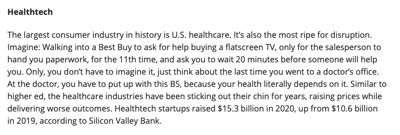 I have heard Tim Cook (Apple CEO) say quite clearly that when we look back on Apple, we'll realize that their biggest contribution will be in healthcare. I don't know what that means, except that I know they're just getting started in health. I saw Scott Galloway's newsletter (you should subscribe for free) on the post-covid economy and it reminded me of what Tim Cook said and how big the opportunity could be: