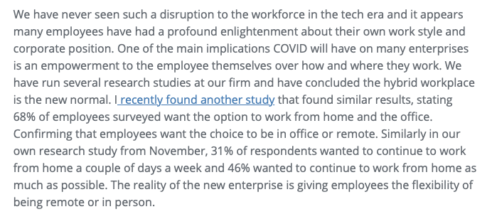 - I so strongly believe that people are way too optimistic about the disruption to the workplace resulting from the broad use of work-from-home that covid forced on an unwilling corporate America. Some analysis I subscribe to wrote this up really well. I can't share the whole thing ($$$), as it's paid for research, but I will share this paragraph and this other article it links to about people's post-pandemic job plans:
