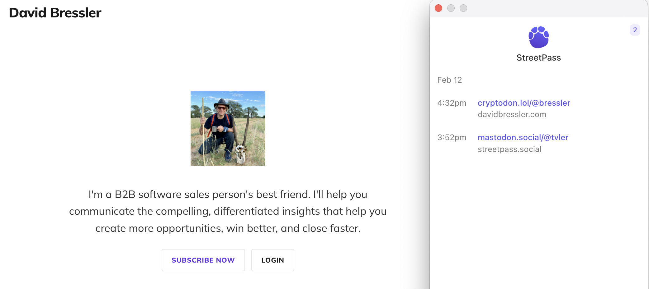 To that end, I found a useful chrome/firefox (soon for Safari) plugin called Streetpass that keeps track of people on Mastodon who own the sites you visit. Mastodon has a little snippet you install in your site and it gets verified to your profile. It's a nice little feature. Here's what it looks like on my site: