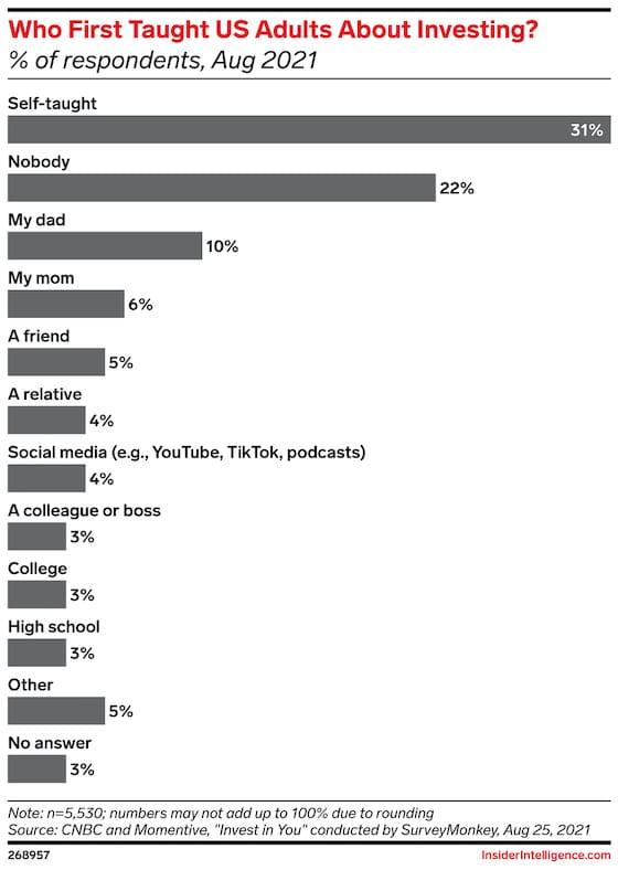 More than half of US adults were first taught about investing by either themselves or nobody (admittedly, data is 3+ years old):